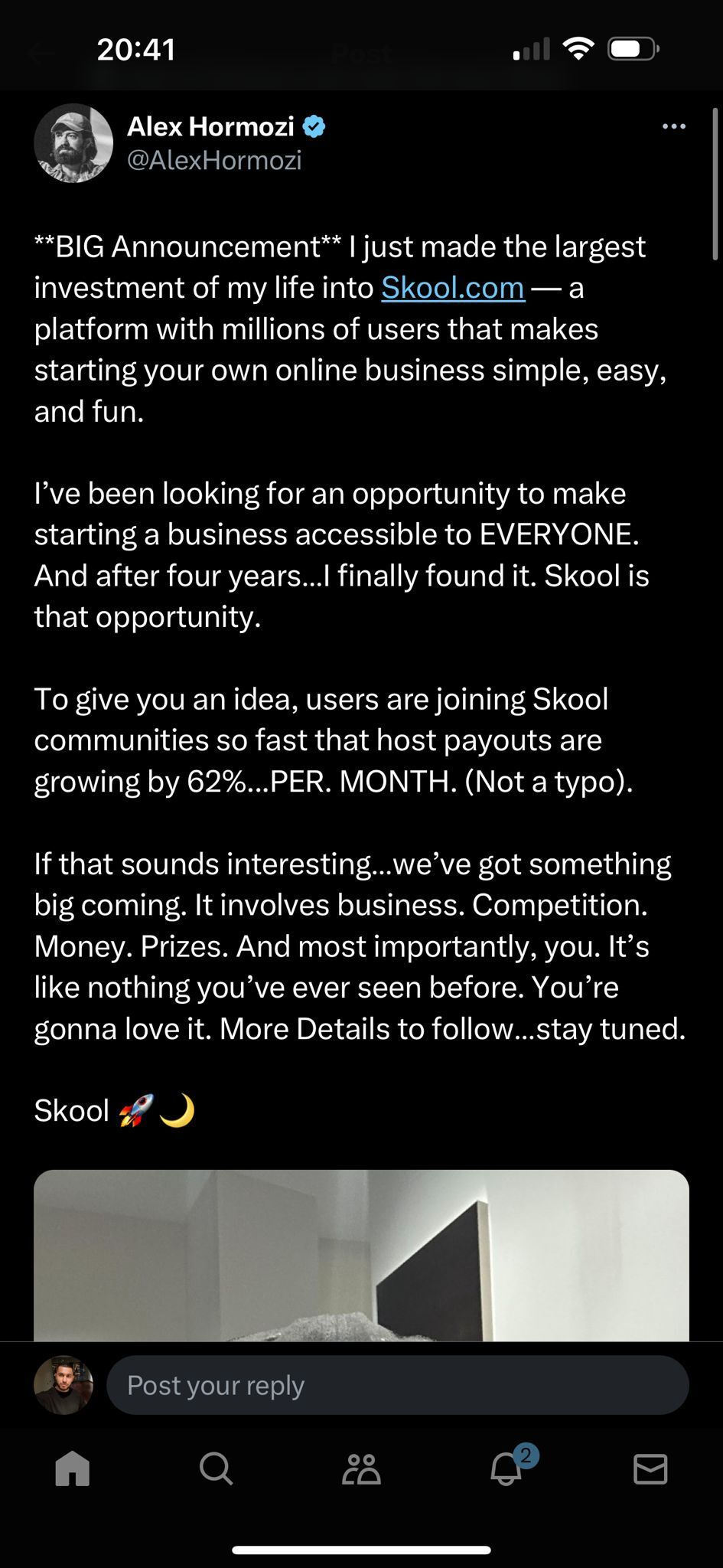 An example of one of those shifts is this news of the βFamous entrepreneur Alex Hormozi investing into Sam Ovens skool community platform to take on the giants in the industry like Facebook and other group/community platforms and serve the Info-Products, Coaching, Agency, Consulting Space.
