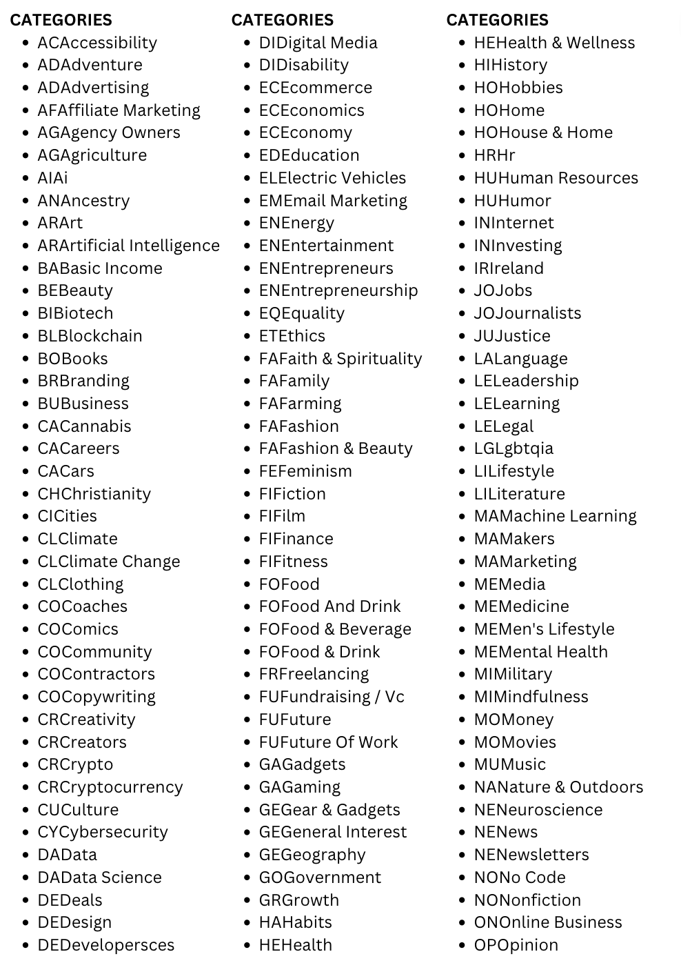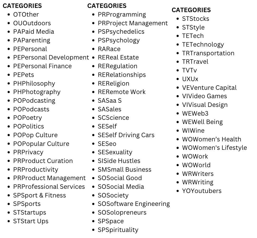 Tip: Follow the process i share on my masterclasses or simply choose one from the category below β Disclaimer: not all categories are to be found on the beehiiv platform (image below contains list found on openletters)