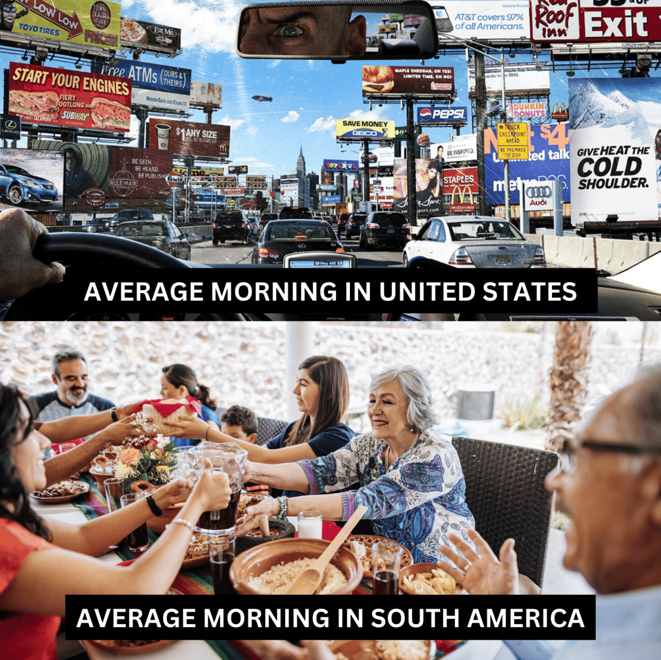 People are more interacted with each other and food is healthy is very healthy there, mostly organic.