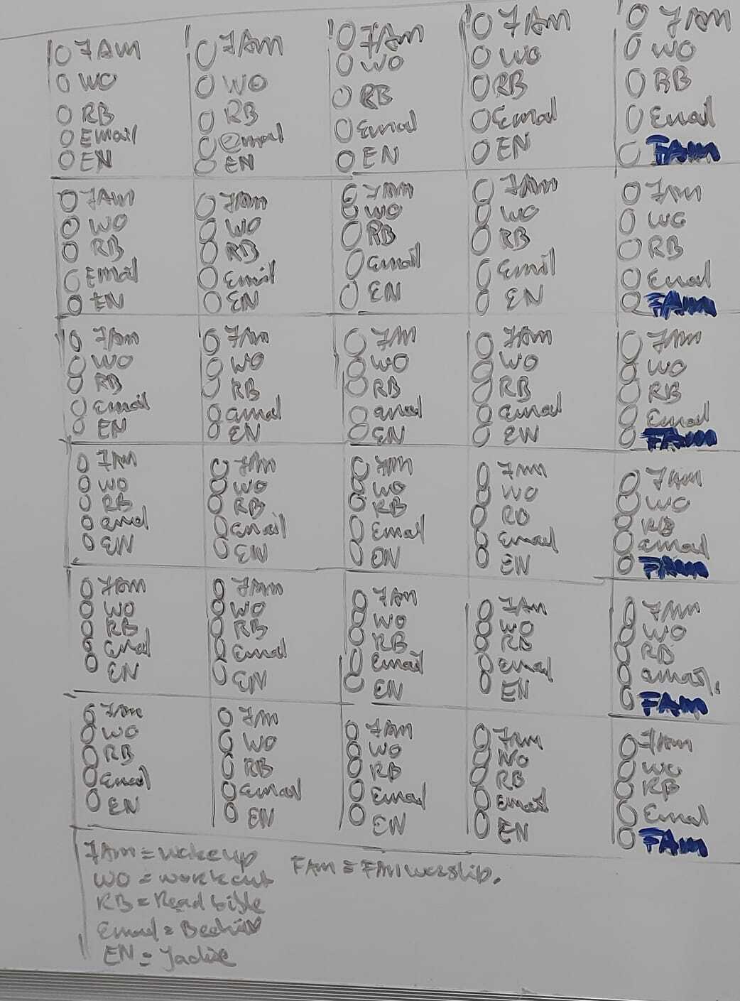 As seen from my whiteboard schedule: Itβs a daily βNo pain - No Gainβ approach that compounds into monthly and yearly success, therefore;